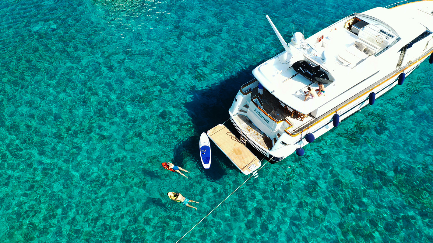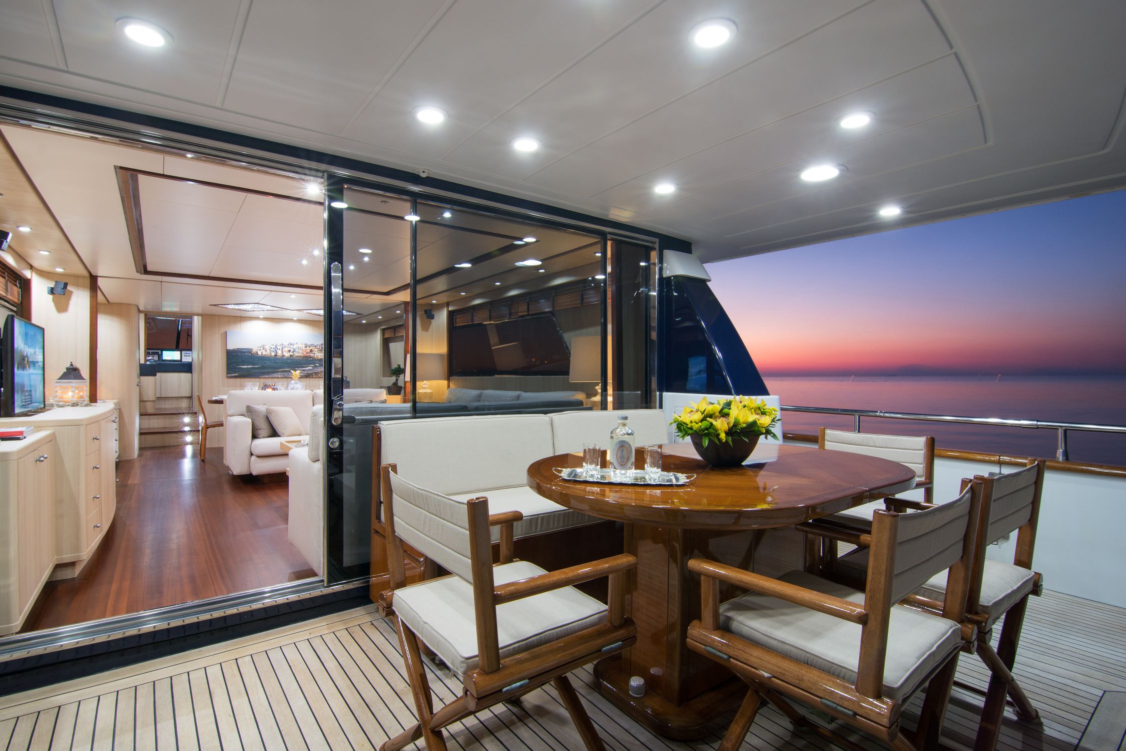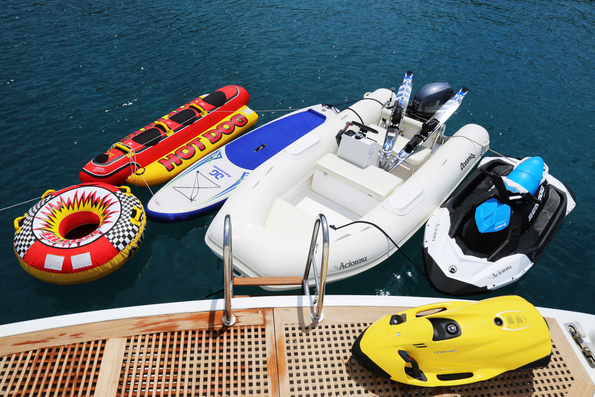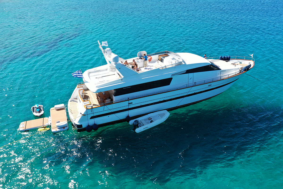 Classic Sanlorenzo ACIONNA, a popular charter yacht with timeless styling and excellent al fresco areas, accommodates nine guests in four spacious suites. Launched in 2004 with a 2019 refit, she offers a relaxing interior in neutral colors and exterior spaces much larger than generally found on a yacht in her size range. Her open-top flybridge is a versatile space for seating and dining. A family-friendly vessel, she offers a selection of toys including a jet-ski, two Seabobs, a wakeboard and water skis, two floating platforms, and a paddle board.