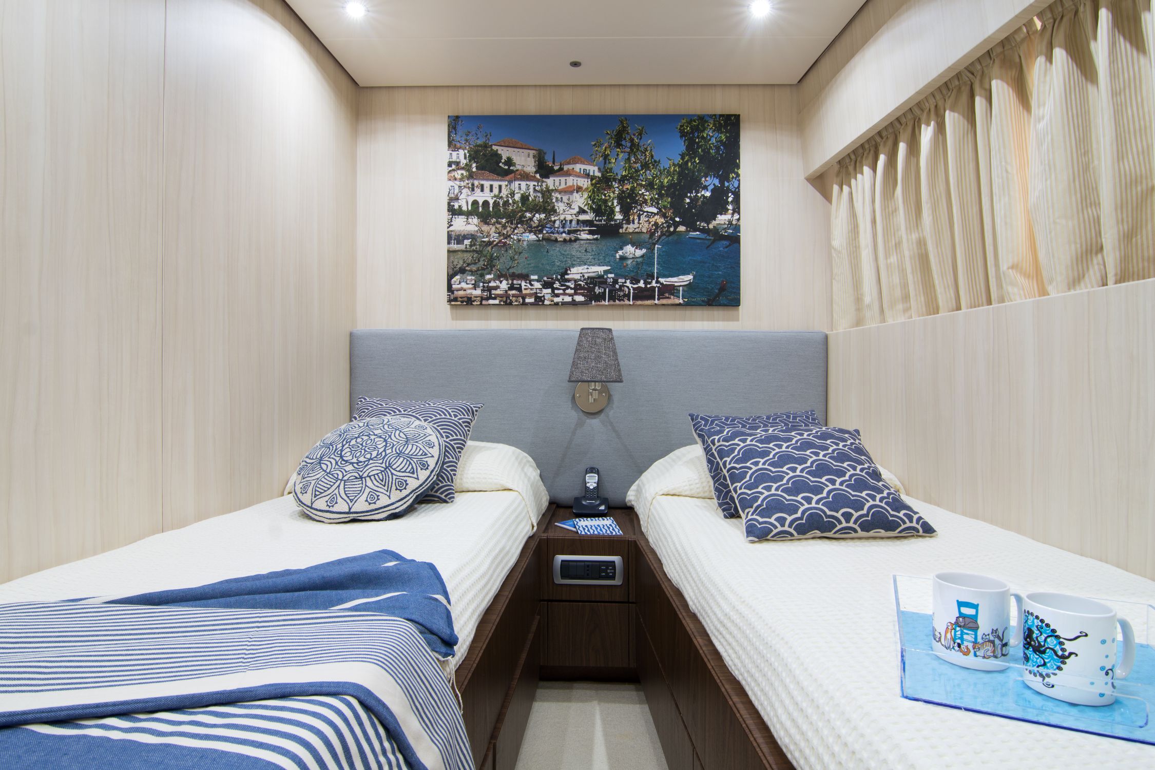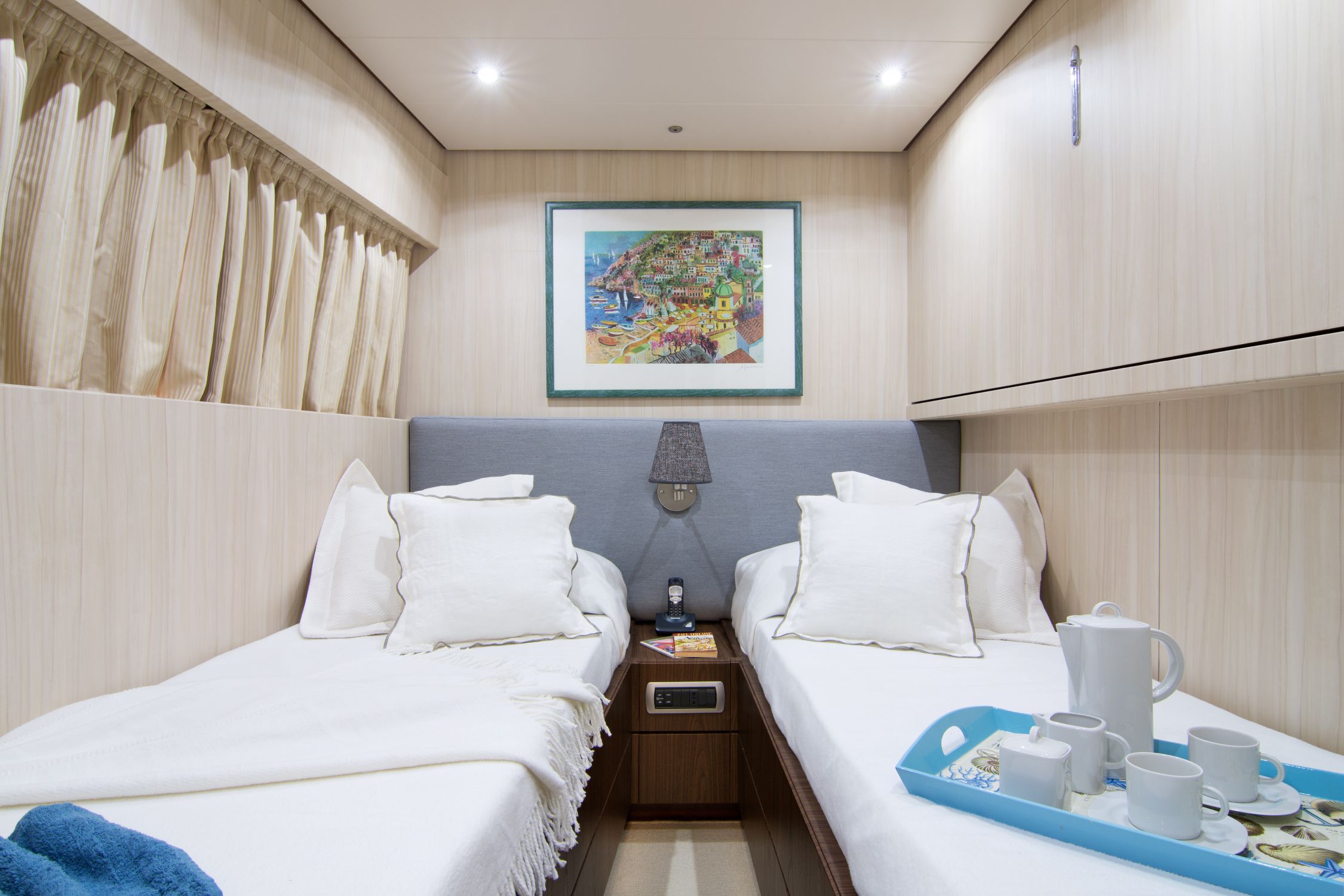 CONFIGURATION: One Owner's suite with king size bed, One VIP stateroom with double bed, One stateroom with twin beds convertible to double bed, One stateroom with twin beds plus a Pullman berth. All with en-suite facilities.