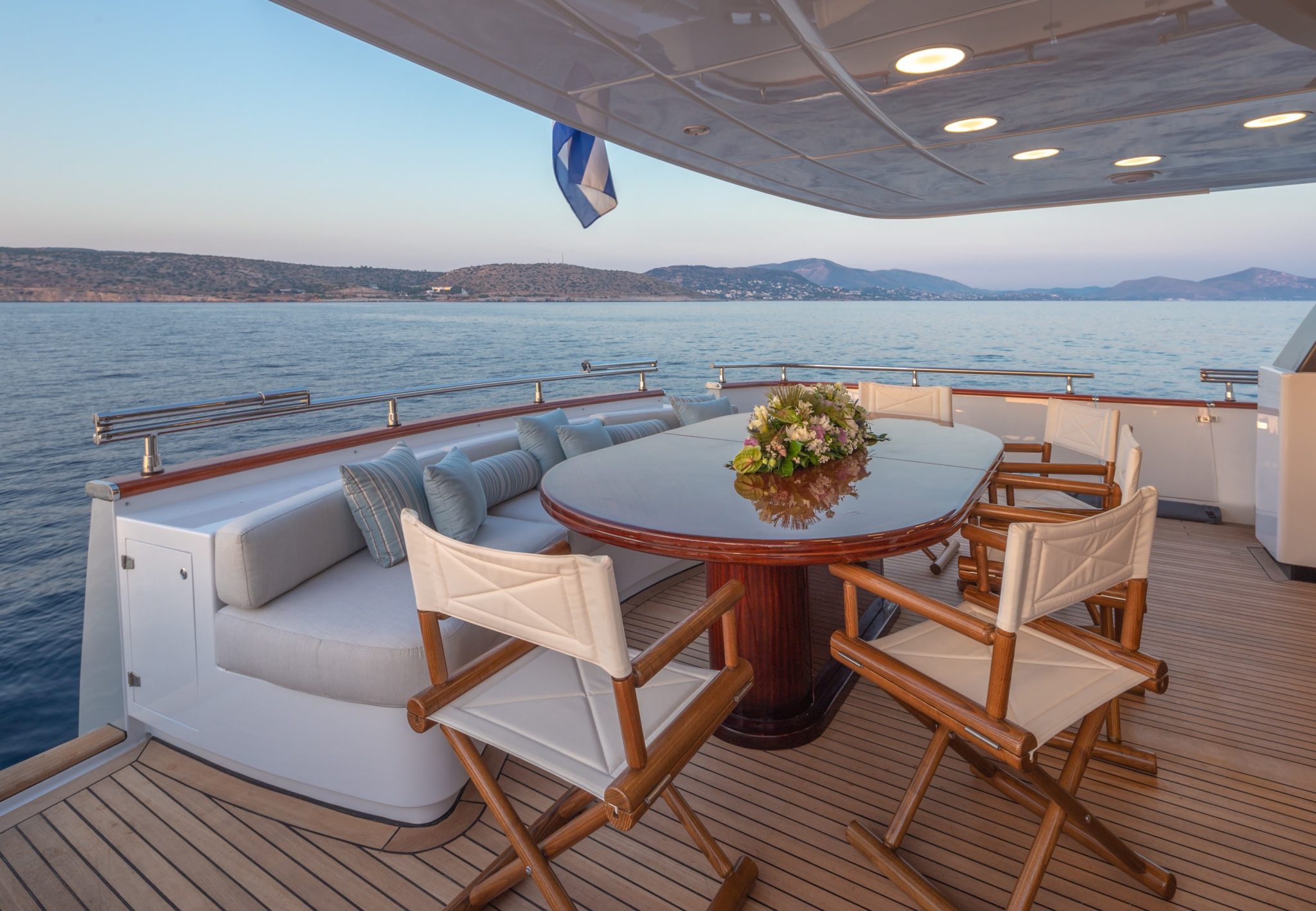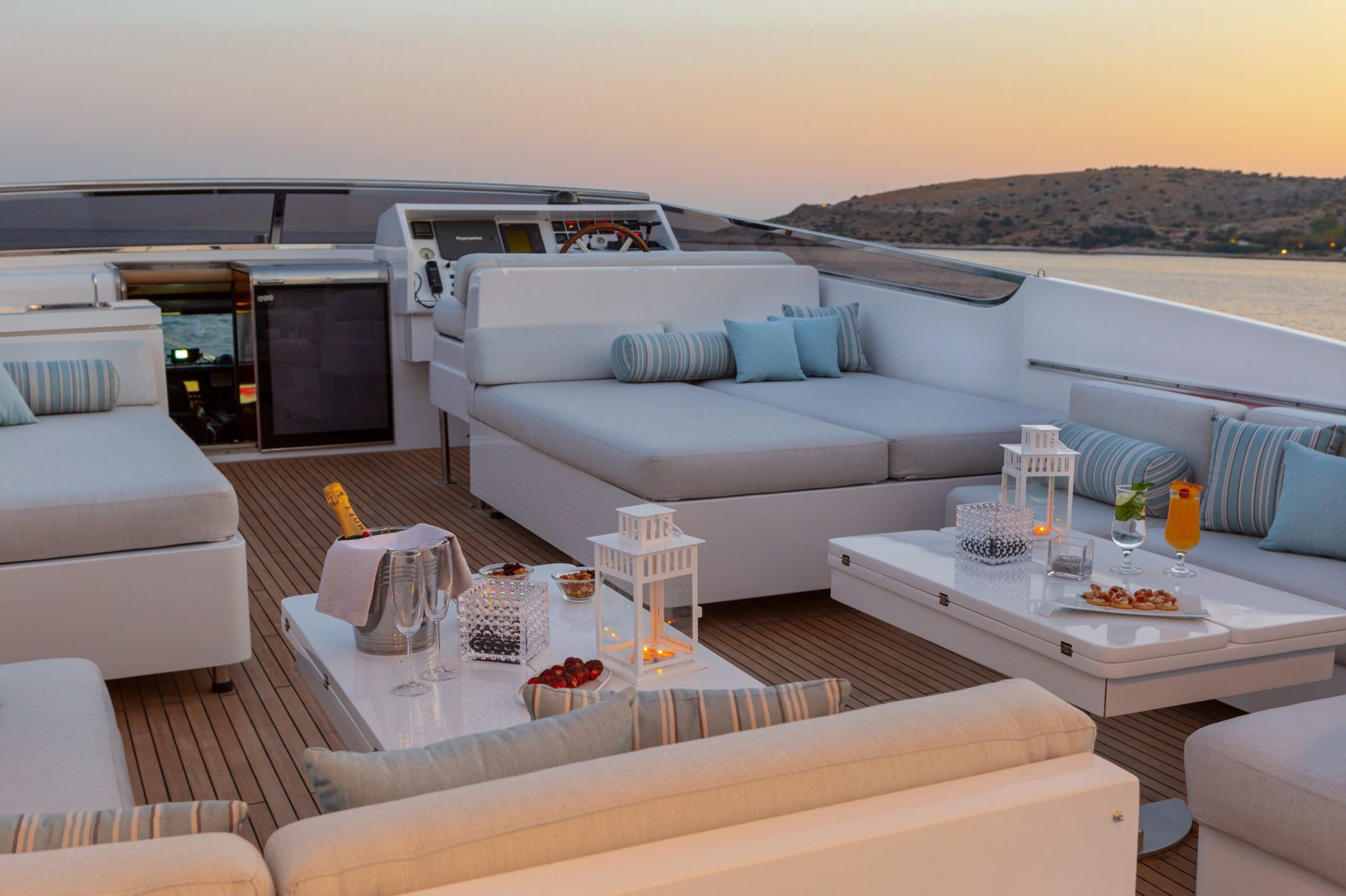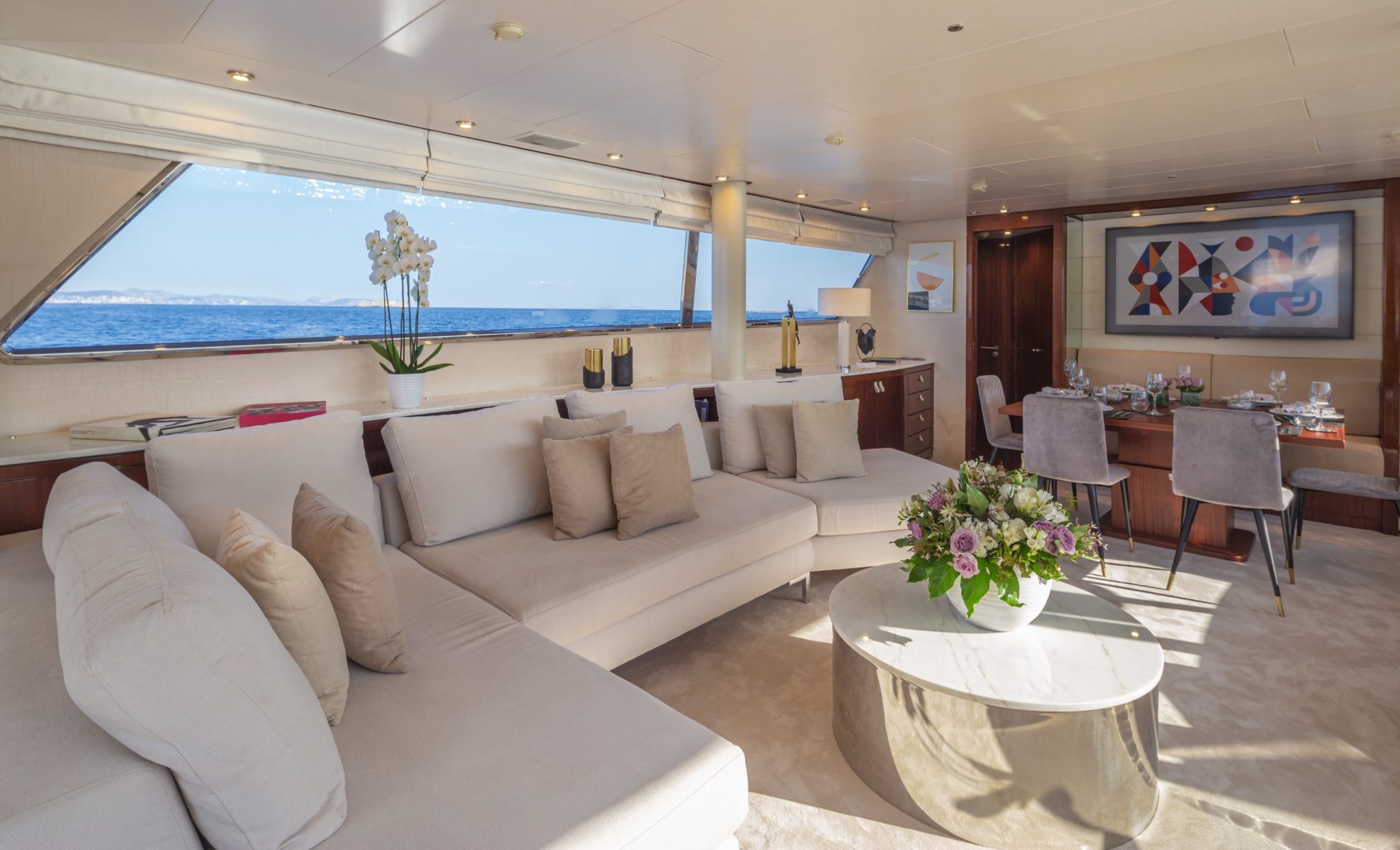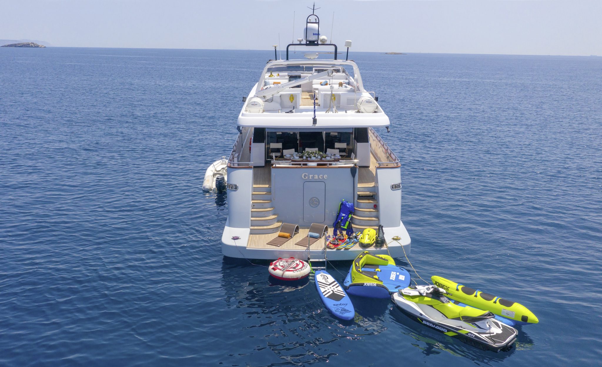 Simple elegance and comfort is abound on this beautiful San Lorenzo motor yacht GRACE (EX Polar Star). With neutral colors and clean lines throughout the yacht, guests will feel at ease at once. With four staterooms, each with en suite facilities, she comfortably accommodates eight guests. There is an Owner’s cabin with a Jacuzzi tub and shower en suite, a VIP cabin and two twin cabins. The salon is spacious and ideal for relaxing or entertaining before dining in the formal dining area while the lovely aft deck seating area the perfect place to dine al fresco, with gorgeous views all around. This fast yacht cruises at speeds up to 30 knots!