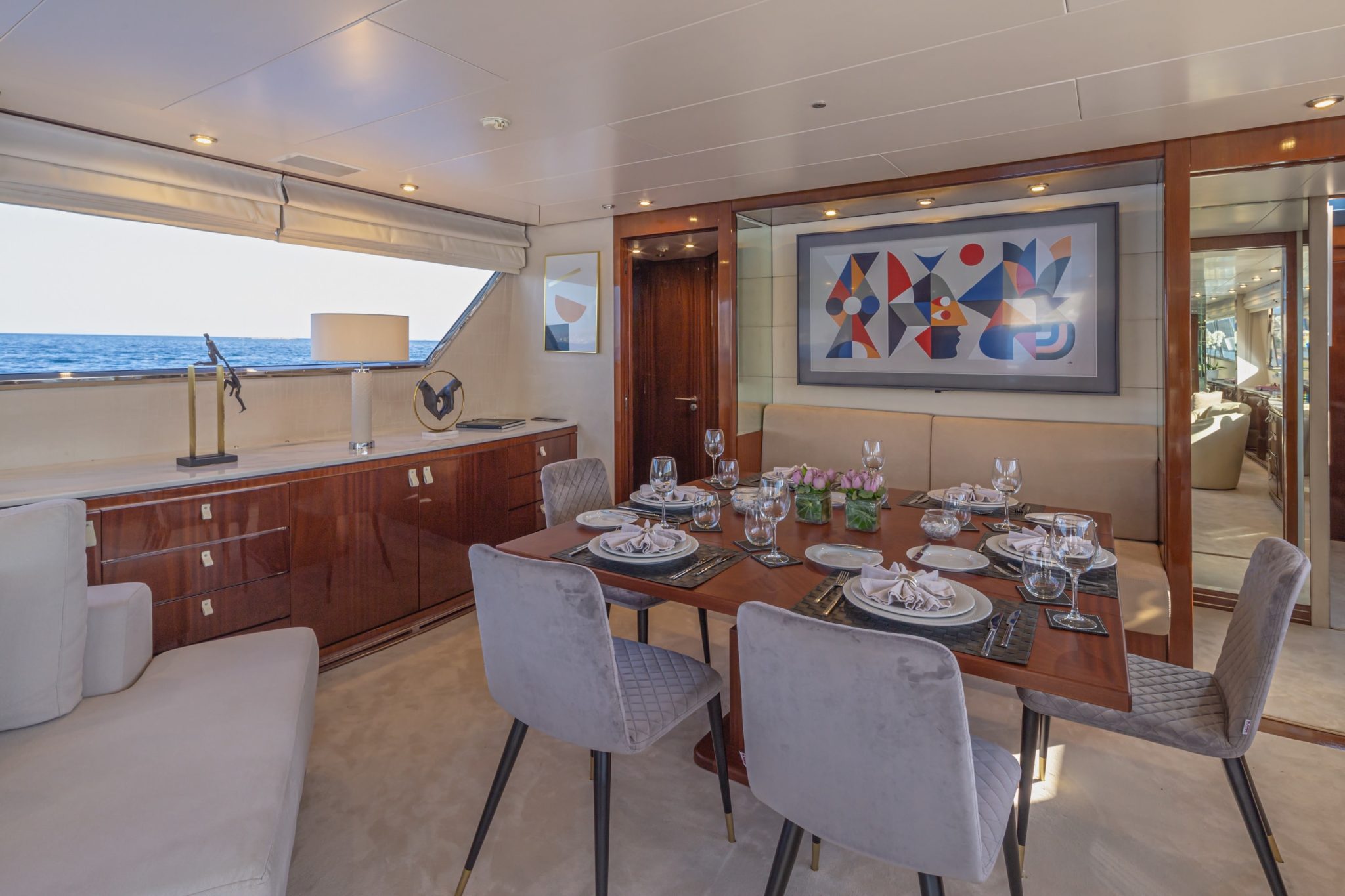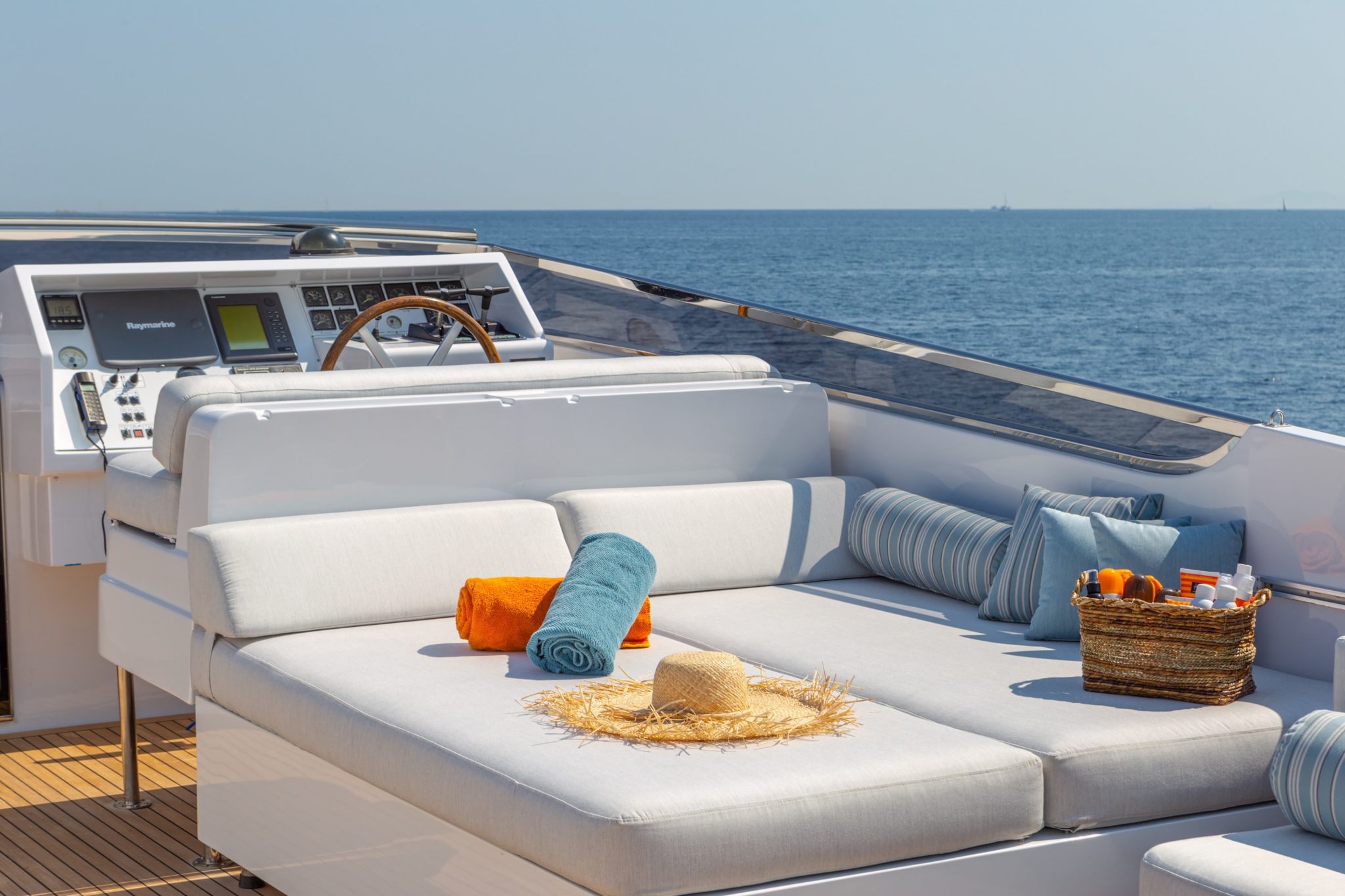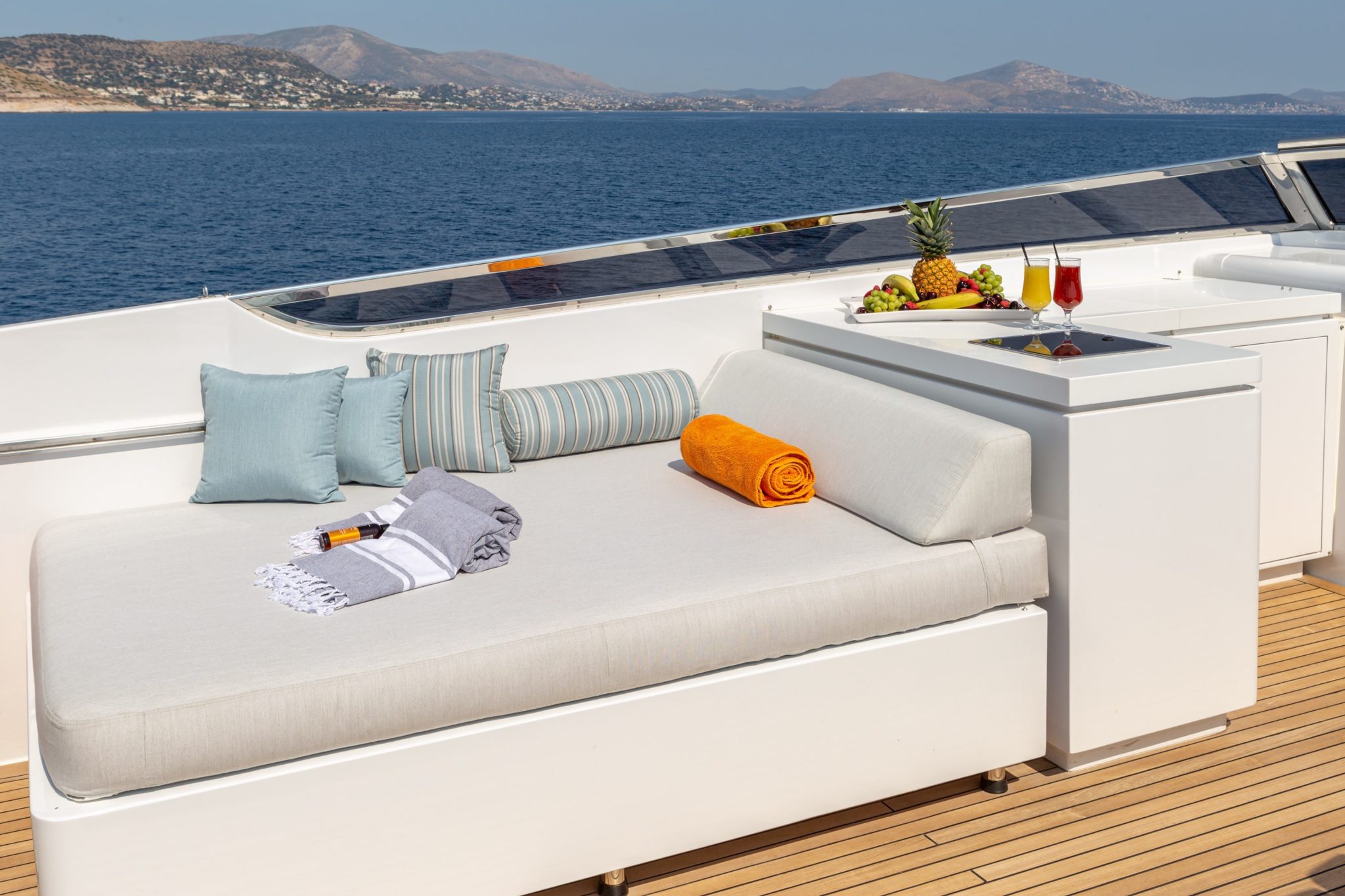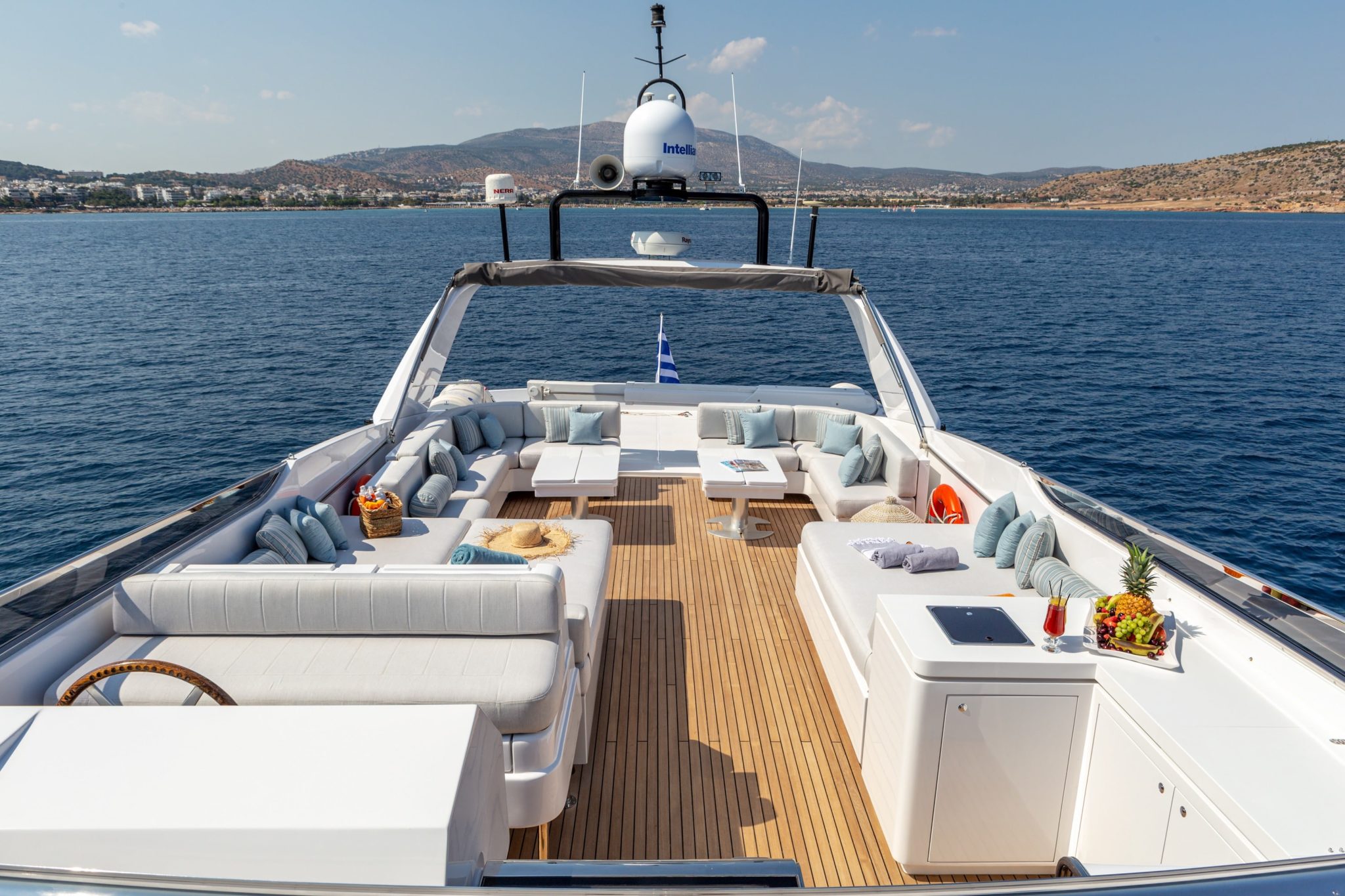 Simple elegance and comfort is abound on this beautiful San Lorenzo motor yacht GRACE (EX Polar Star). With neutral colors and clean lines throughout the yacht, guests will feel at ease at once. With four staterooms, each with en suite facilities, she comfortably accommodates eight guests. There is an Owner’s cabin with a Jacuzzi tub and shower en suite, a VIP cabin and two twin cabins. The salon is spacious and ideal for relaxing or entertaining before dining in the formal dining area while the lovely aft deck seating area the perfect place to dine al fresco, with gorgeous views all around. This fast yacht cruises at speeds up to 30 knots!