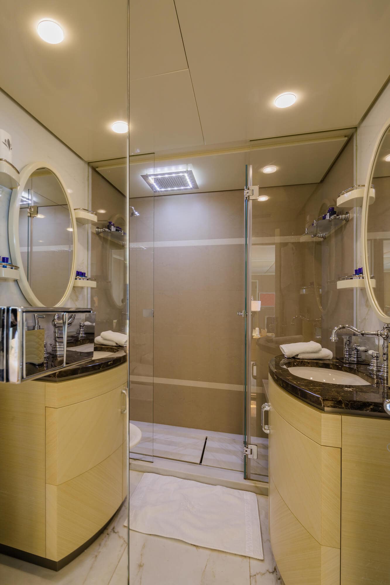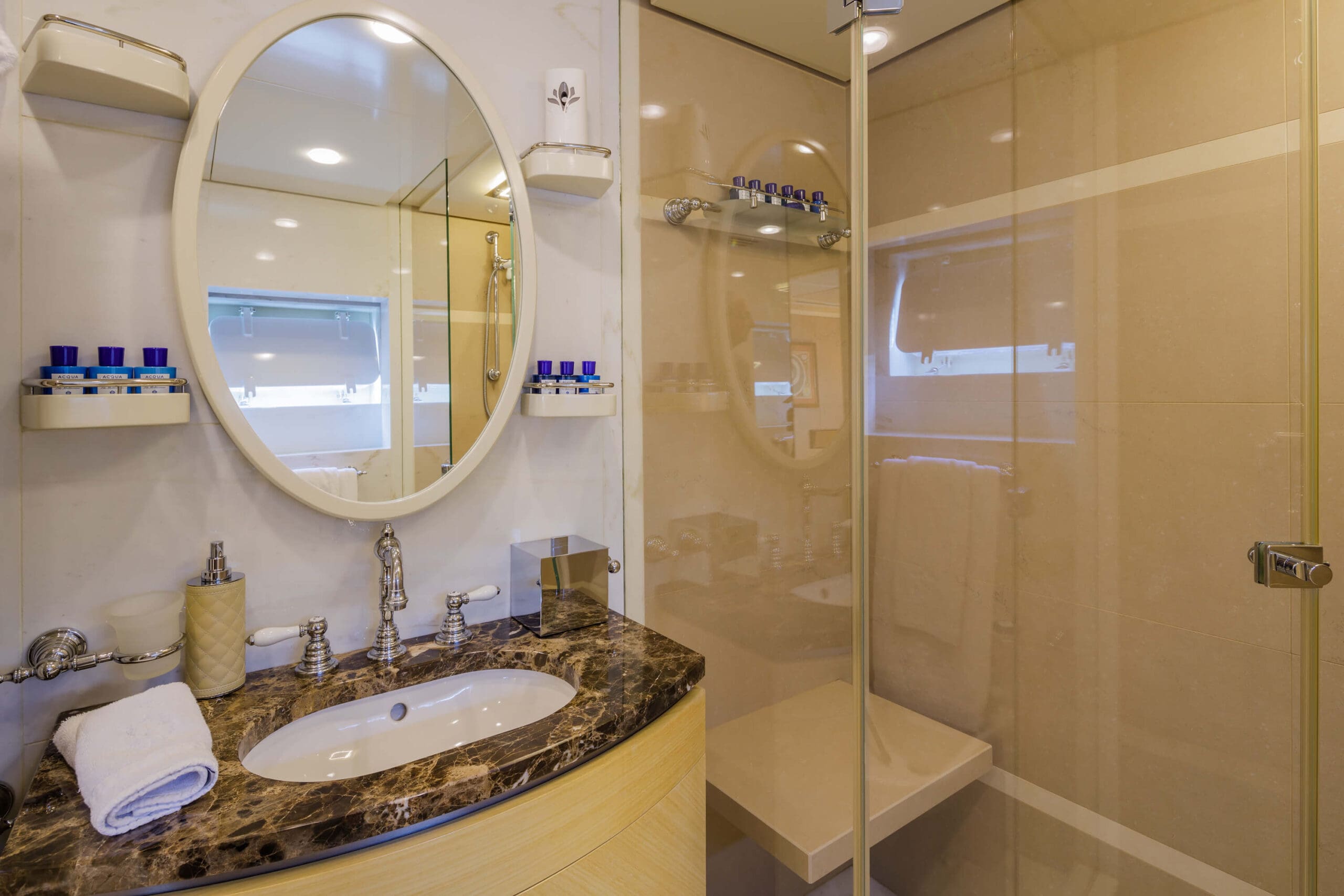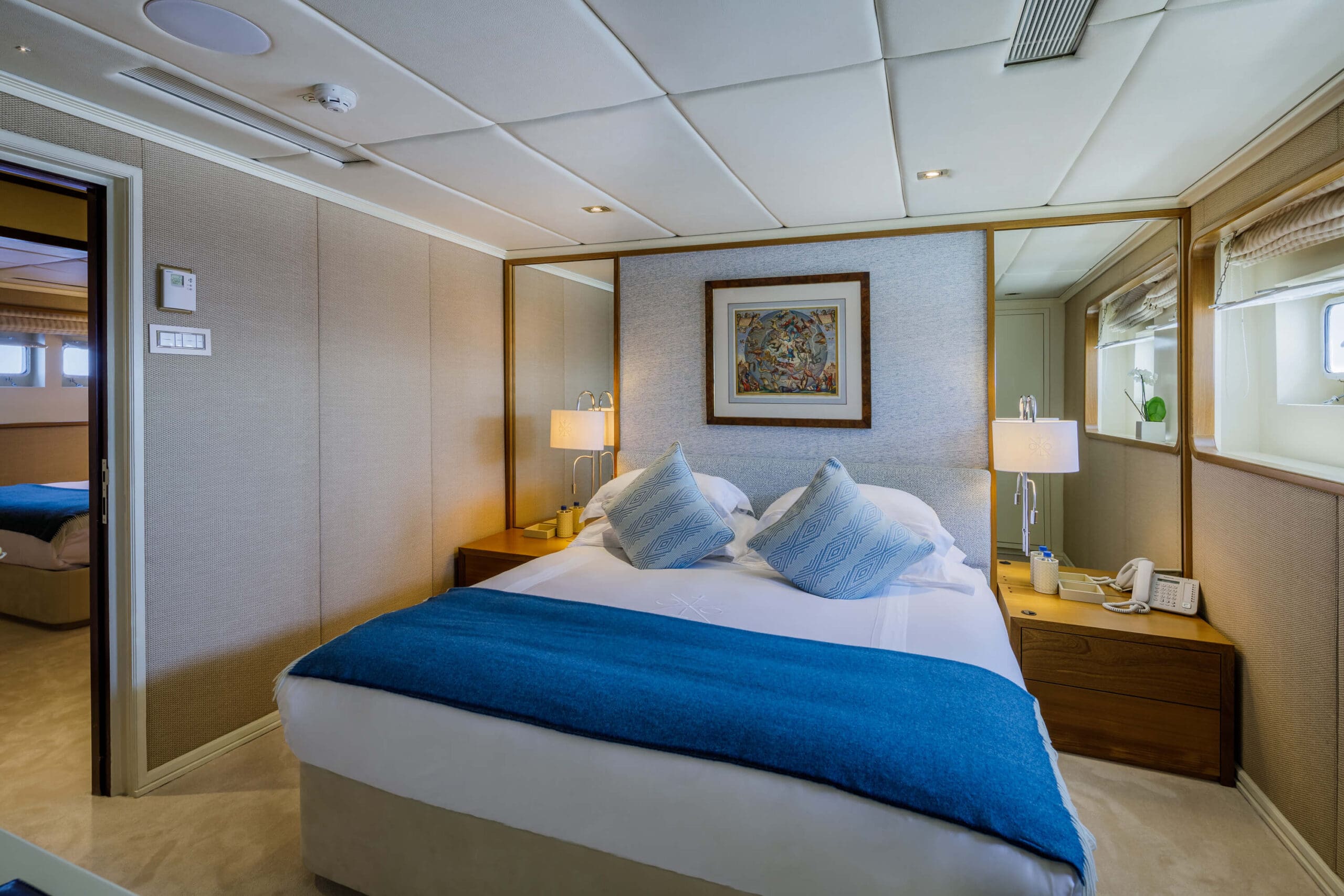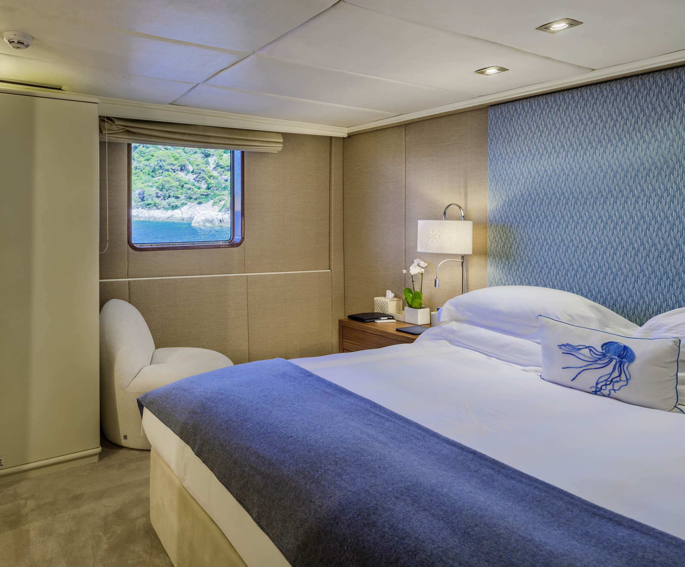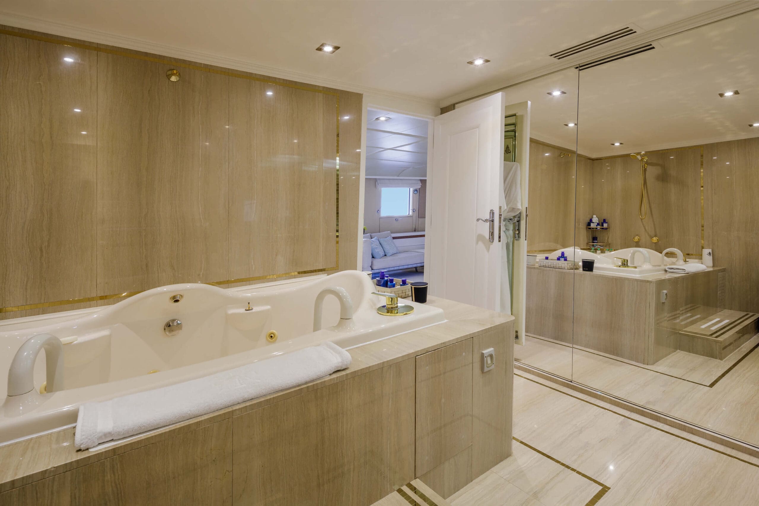 CONFIGURATION: Main Deck: A Master Suite with a super king size bed with a Wardrobe cabin and ensuite facilities (bathtub/jacuzzi & shower) A Vip Cabin with a queen size bed. Lower Deck: Four Double cabins - two of them with king size bed. and the other two with queen size bed. Two Twin guest cabins All cabins with ensuite facilities