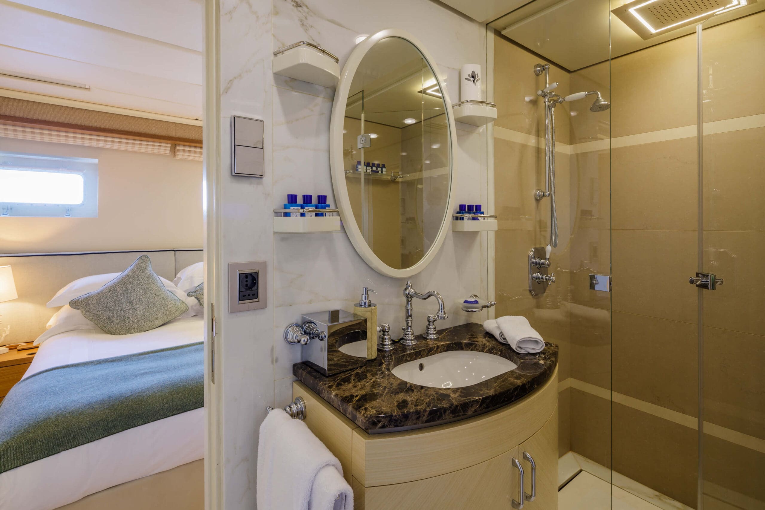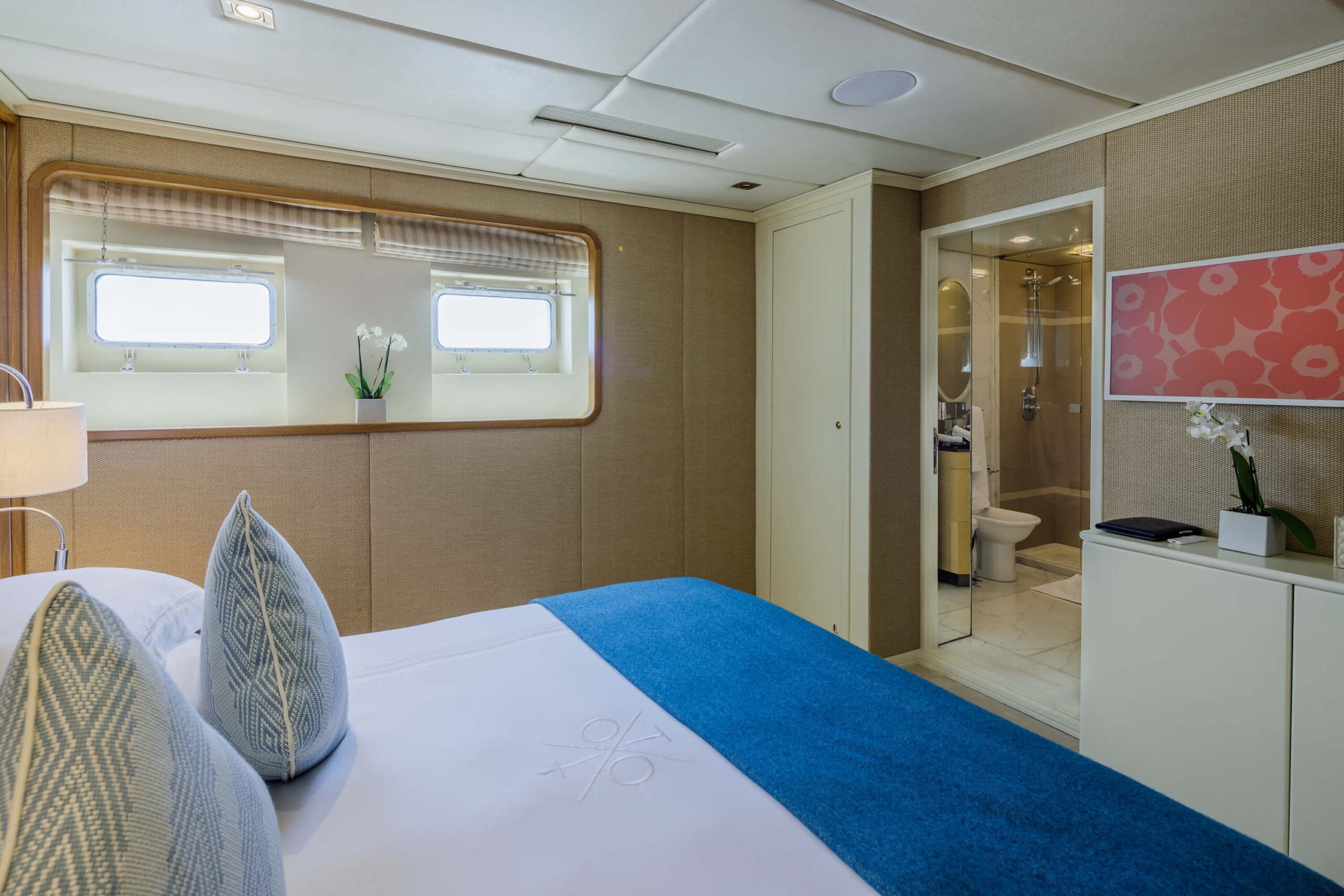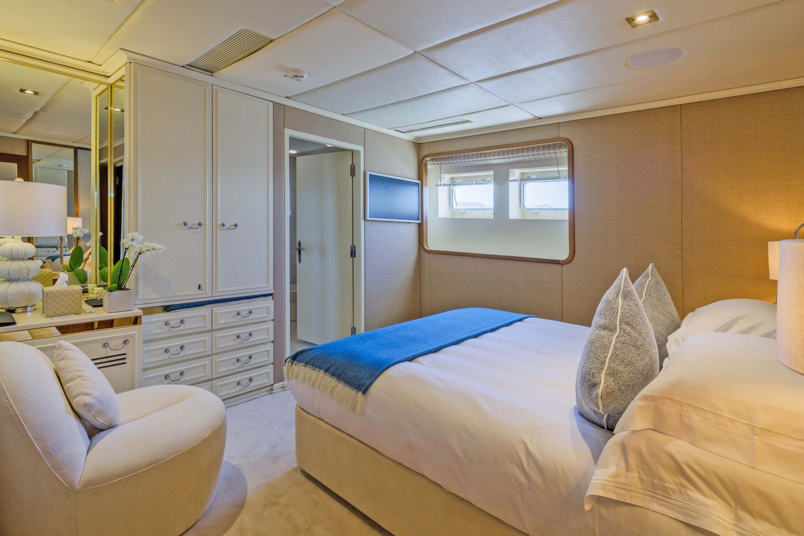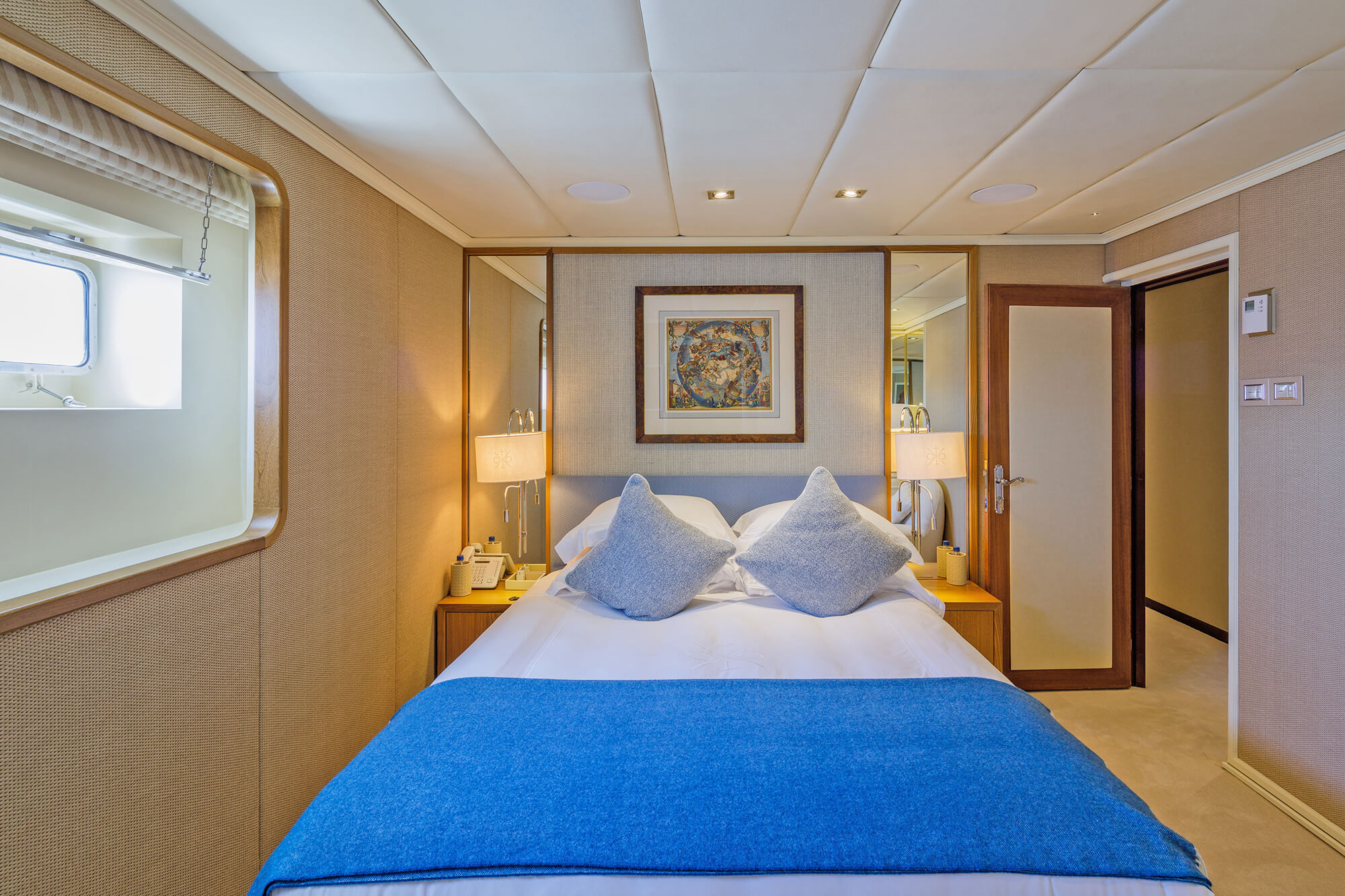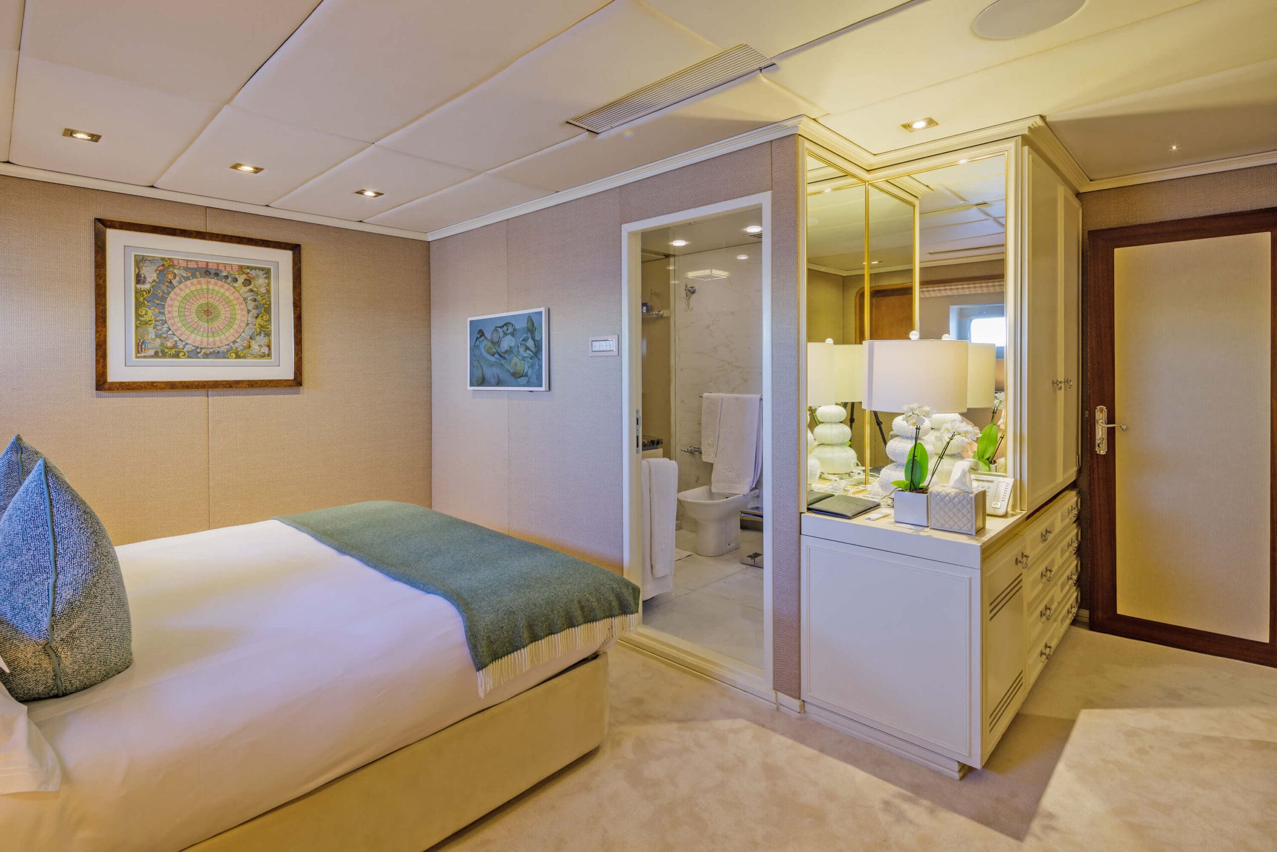 CONFIGURATION: Main Deck: A Master Suite with a super king size bed with a Wardrobe cabin and ensuite facilities (bathtub/jacuzzi & shower) A Vip Cabin with a queen size bed. Lower Deck: Four Double cabins - two of them with king size bed. and the other two with queen size bed. Two Twin guest cabins All cabins with ensuite facilities