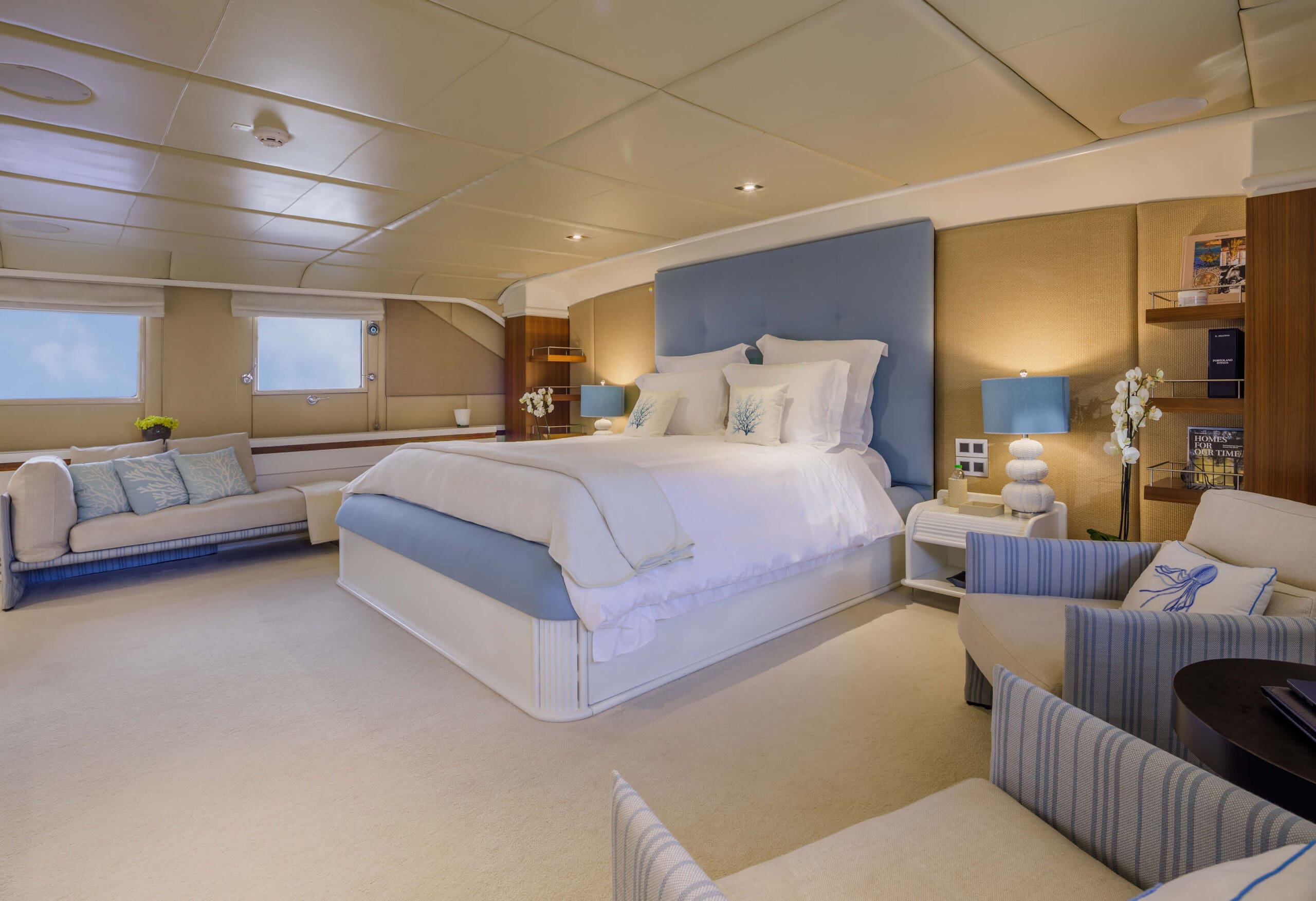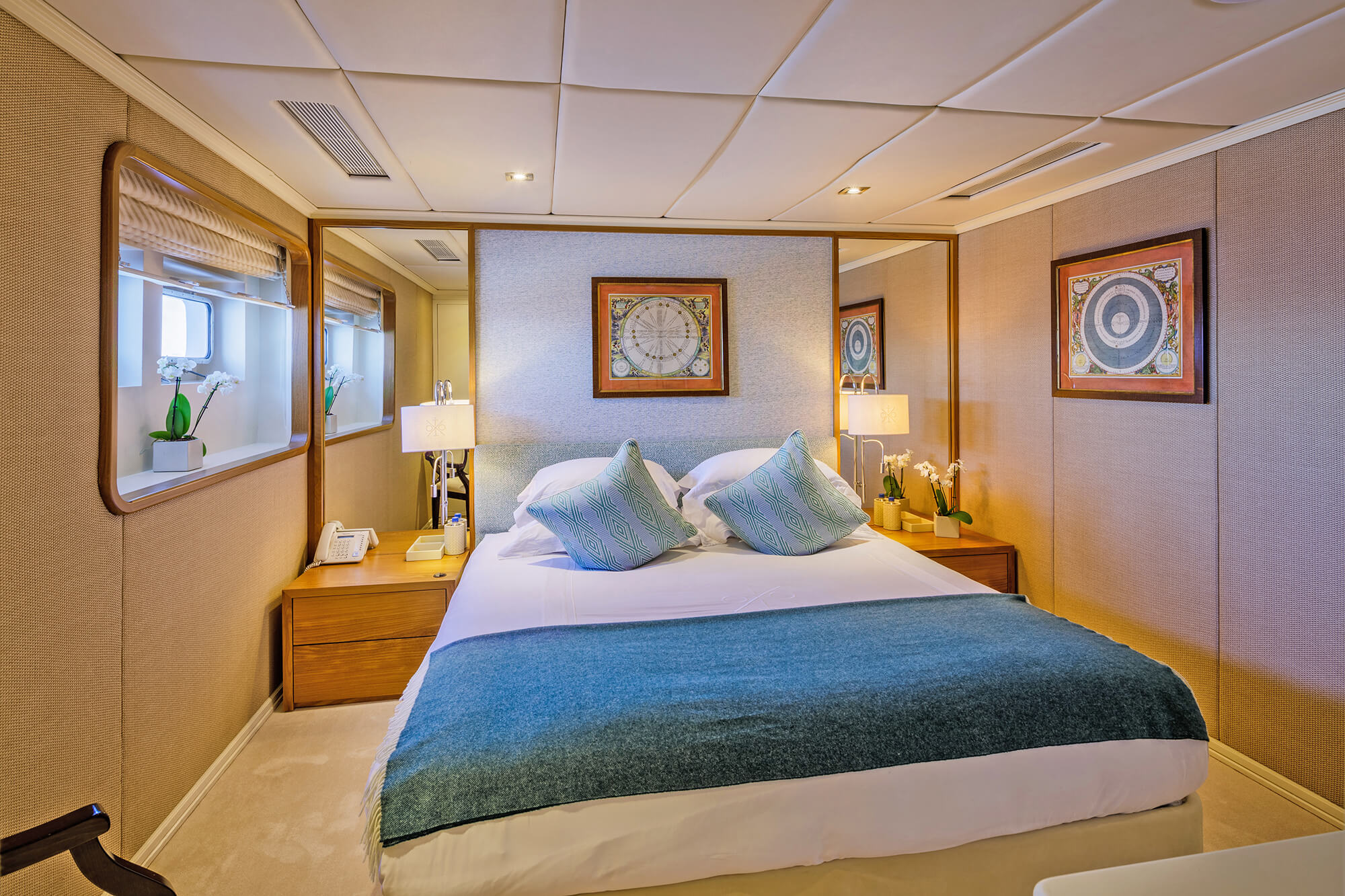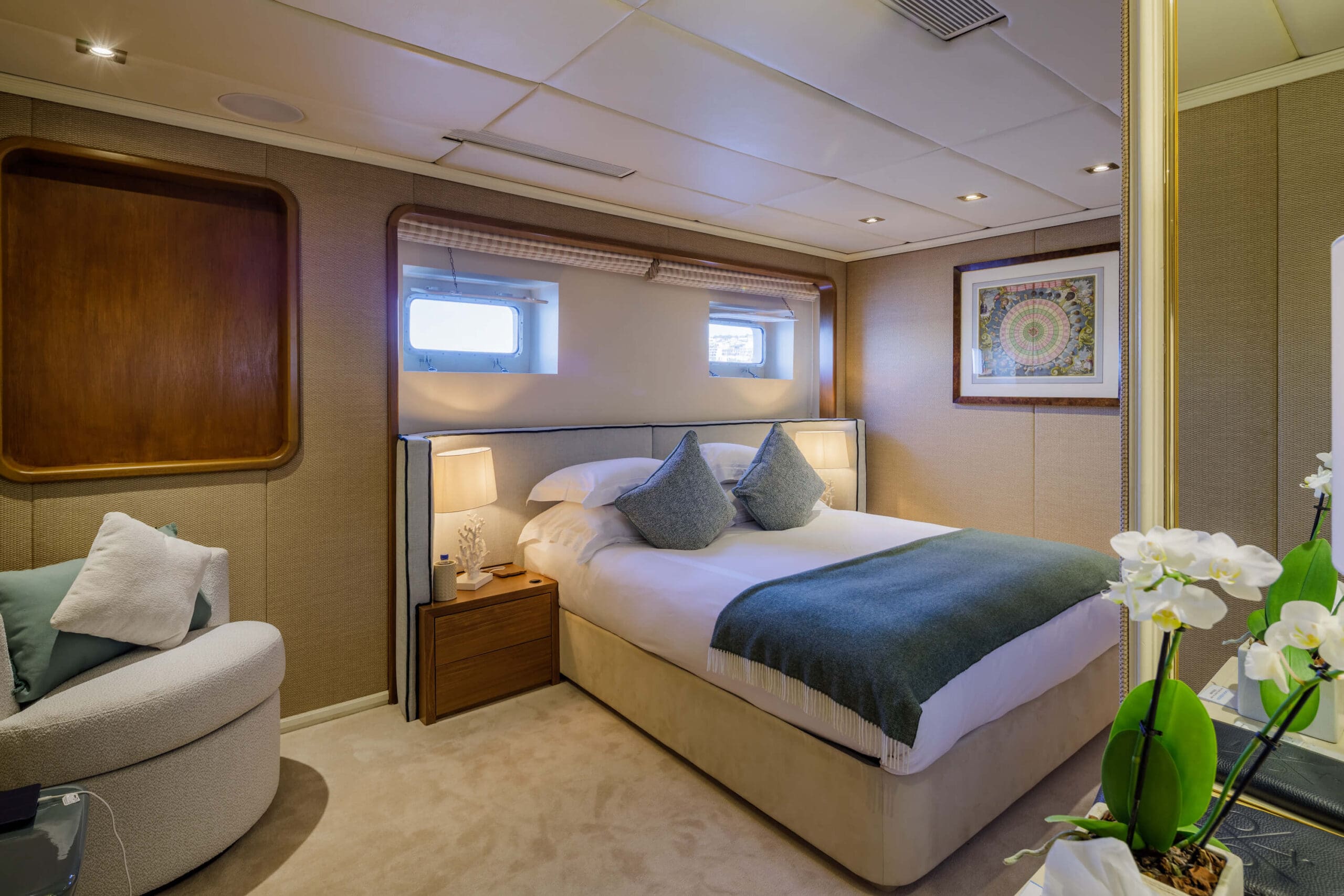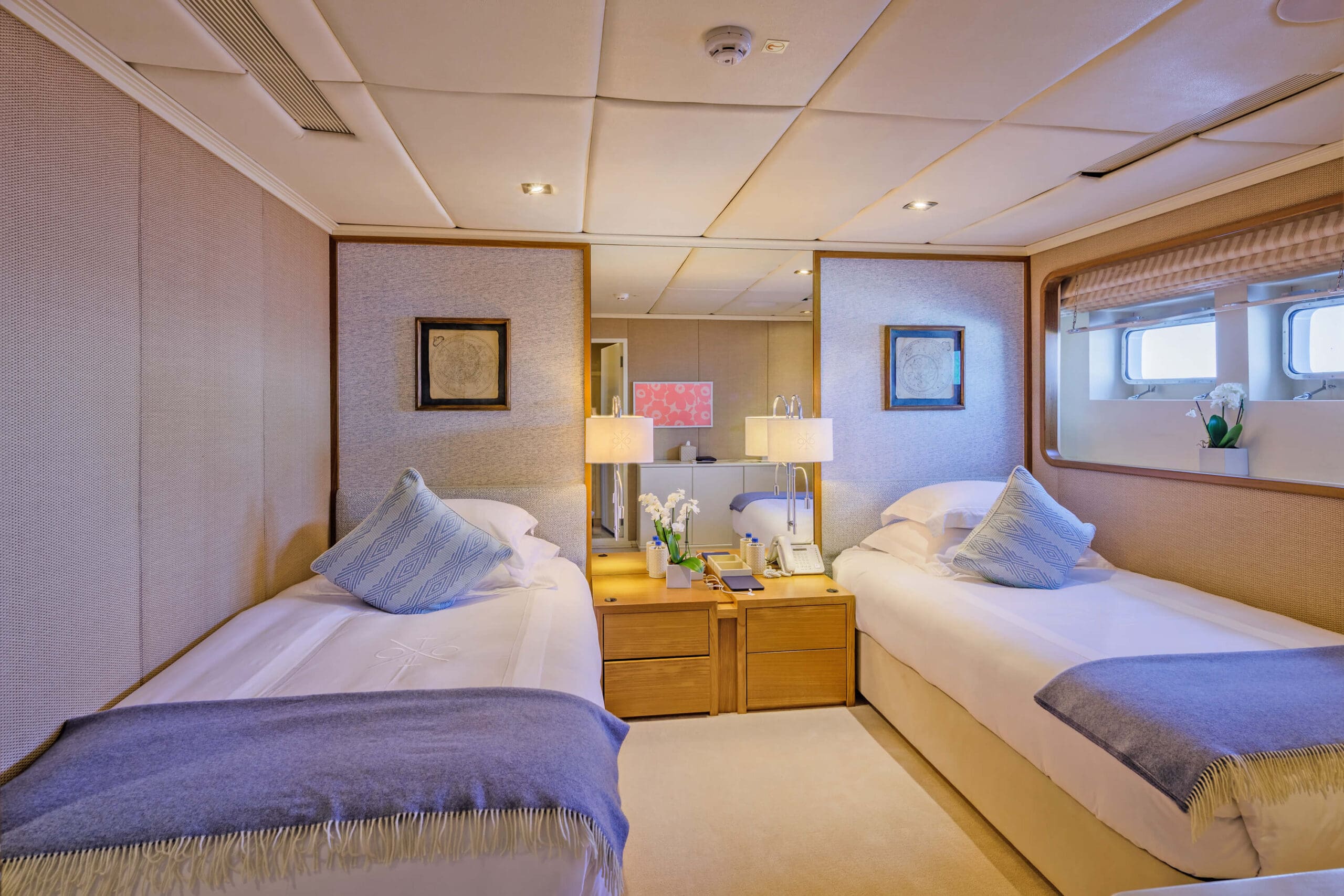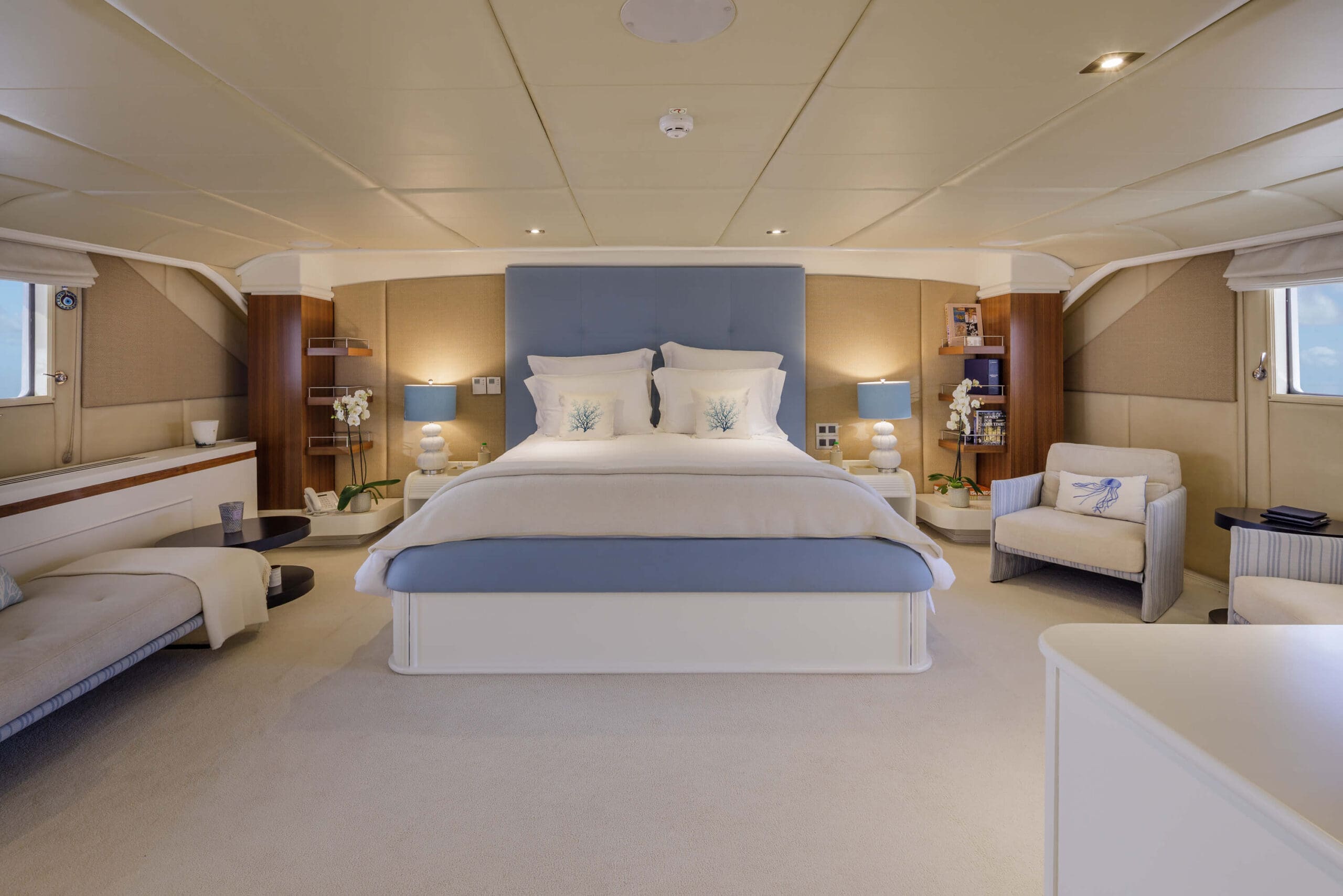 CONFIGURATION: Main Deck: A Master Suite with a super king size bed with a Wardrobe cabin and ensuite facilities (bathtub/jacuzzi & shower) A Vip Cabin with a queen size bed. Lower Deck: Four Double cabins - two of them with king size bed. and the other two with queen size bed. Two Twin guest cabins All cabins with ensuite facilities
