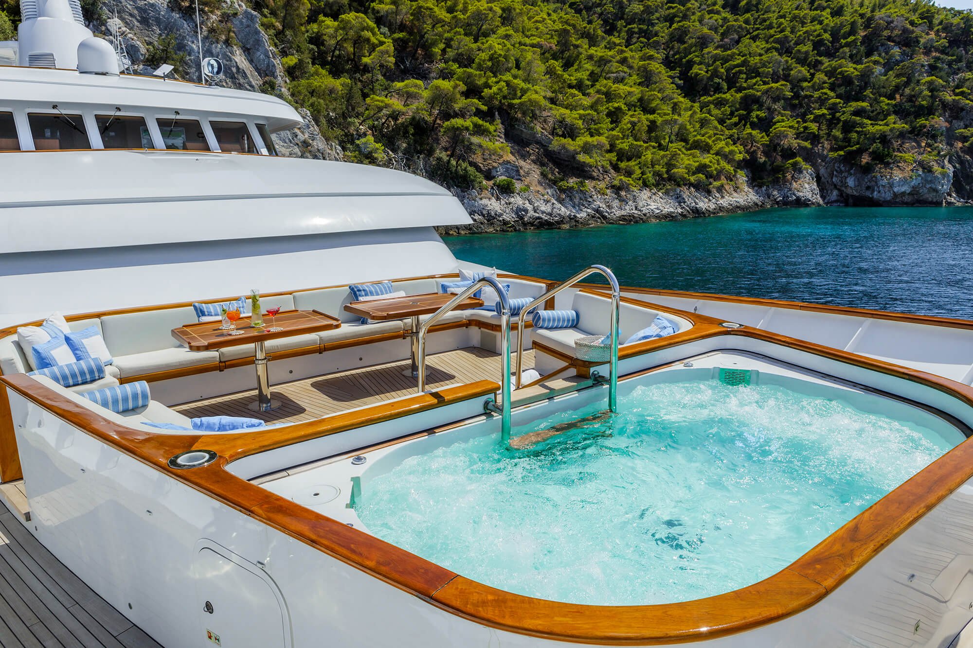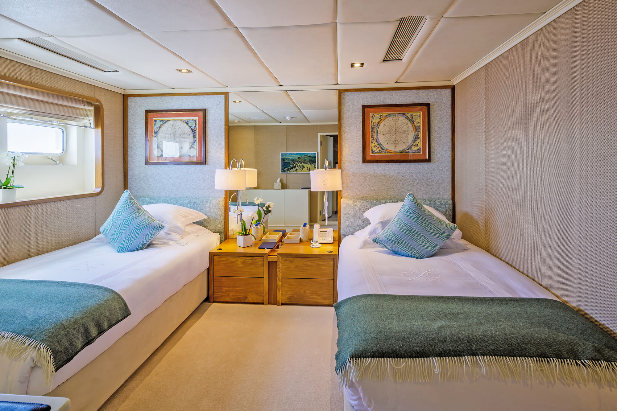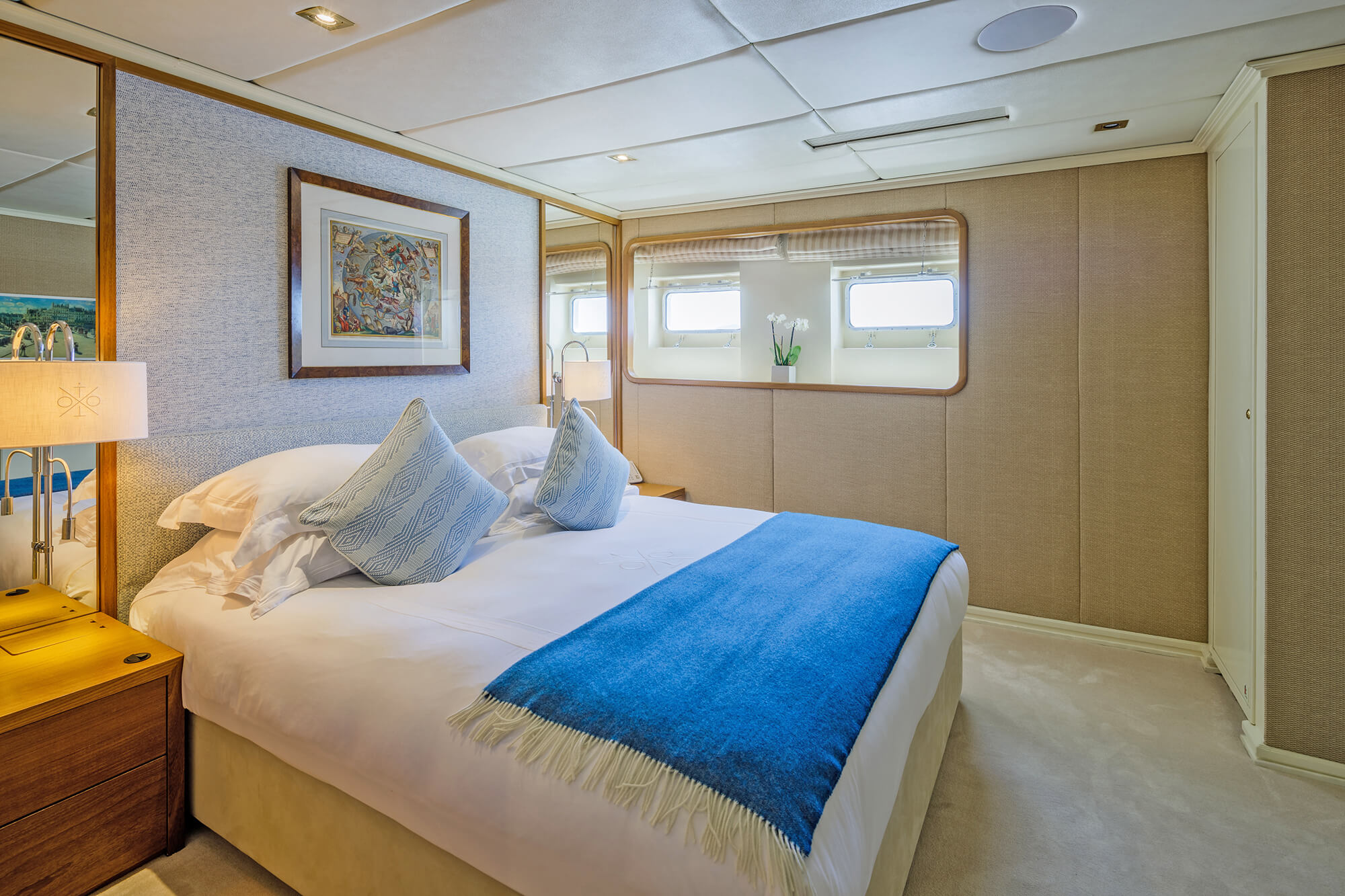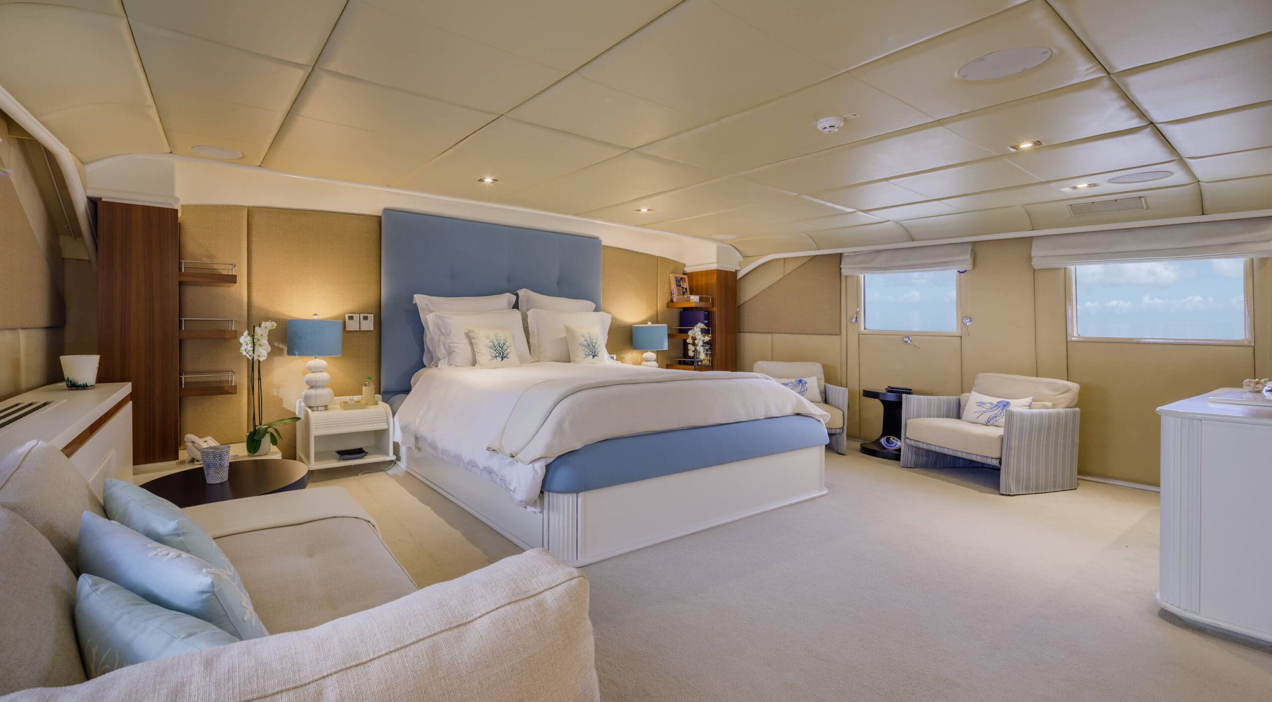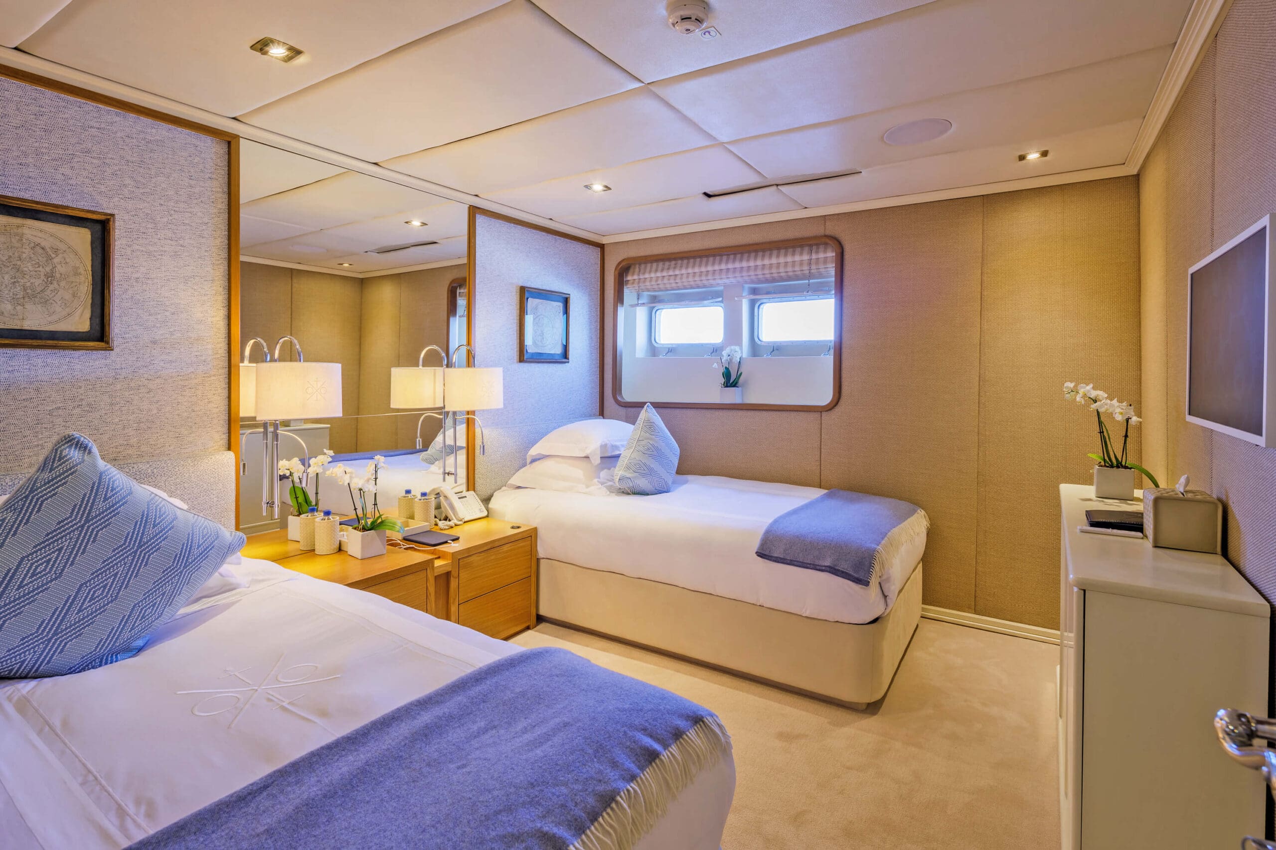 CONFIGURATION: Main Deck: A Master Suite with a super king size bed with a Wardrobe cabin and ensuite facilities (bathtub/jacuzzi & shower) A Vip Cabin with a queen size bed. Lower Deck: Four Double cabins - two of them with king size bed. and the other two with queen size bed. Two Twin guest cabins All cabins with ensuite facilities