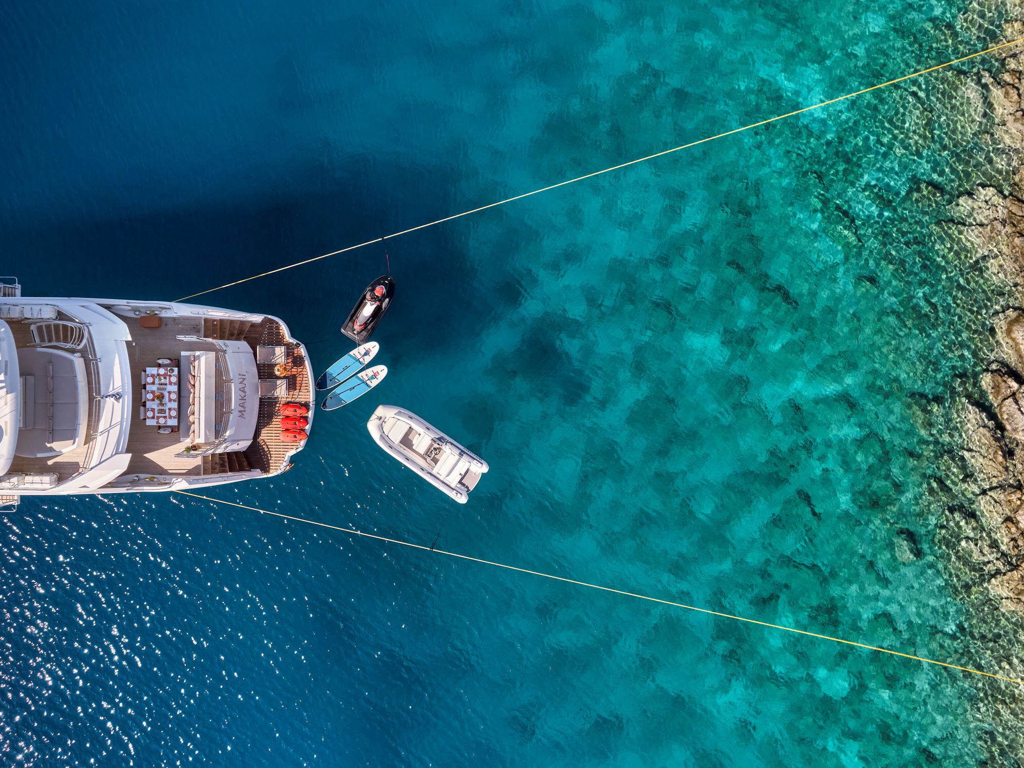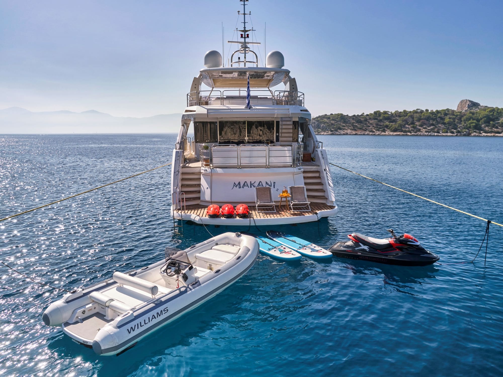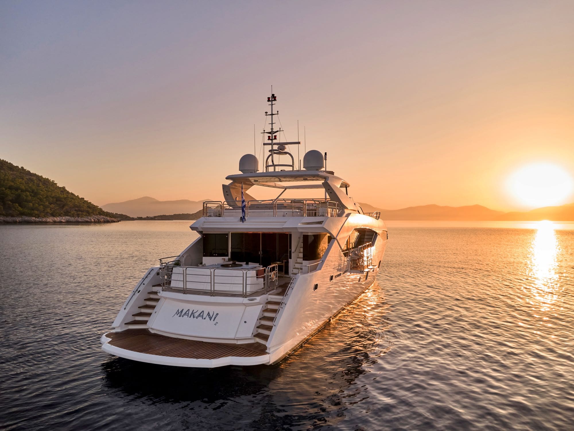 Step aboard MAKANI II, a striking 115 Predator by Sunseeker, built in 2013. This yacht exudes timeless elegance with its strong, aggressive lines and sporty profile. MAKANI II is equipped with all the modern amenities expected of a vessel of its era, including fold-down terraces in the salon, expansive hull windows, a comprehensive stabilization system, and a luxurious Jacuzzi on the sundeck. The yacht’s main deck features an opulent Owner Suite, complete with a dual-entry en-suite bathroom finished in marble. On the lower deck, you’ll find four elegantly appointed guest suites, each designed for comfort and style. The interior of MAKANI II is a blend of light oak finishes, dark hardwood floors in the main salon, and taupe carpeting throughout the accommodation areas, creating a sophisticated and inviting atmosphere. With a dedicated crew of seven,…